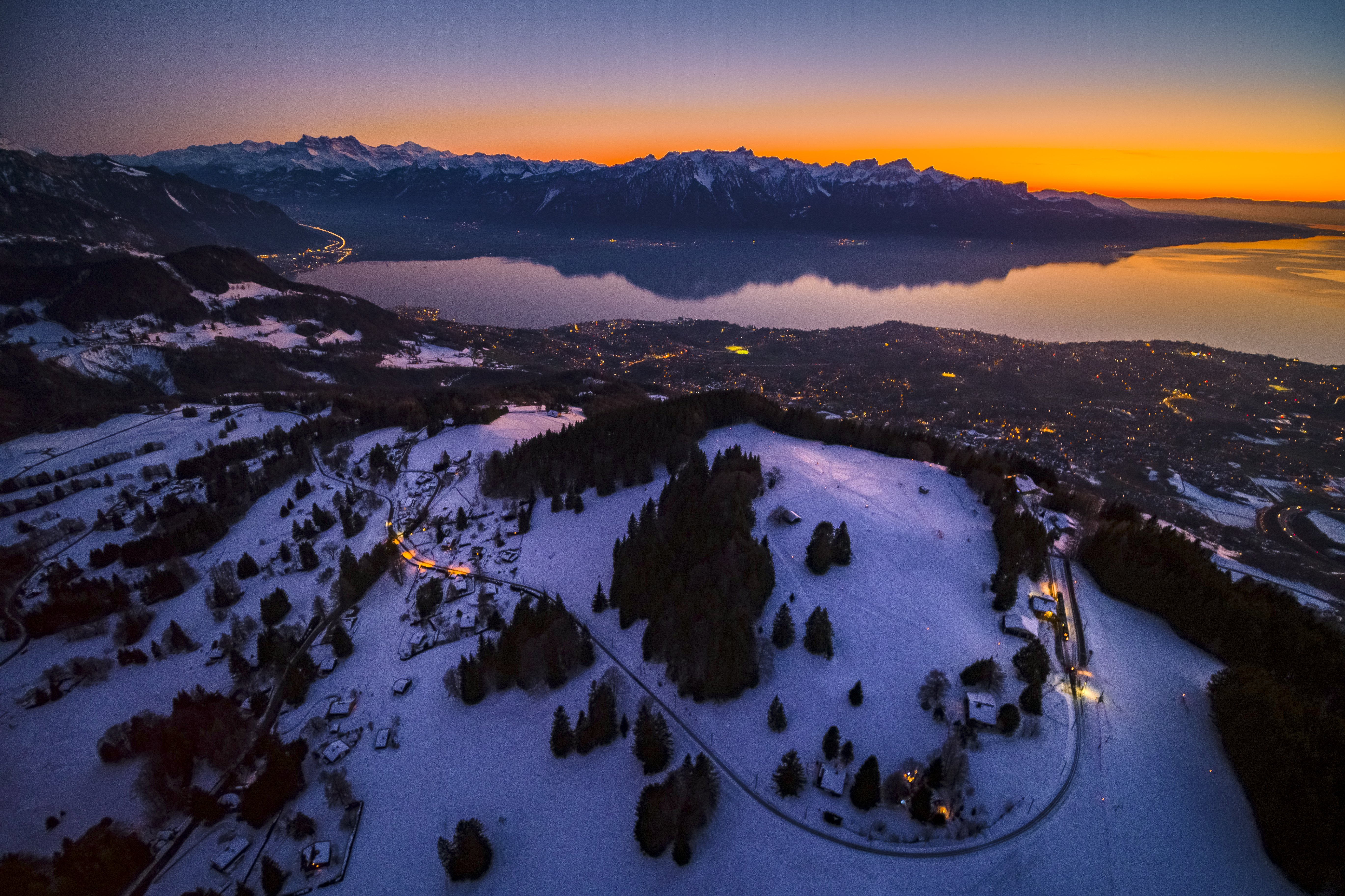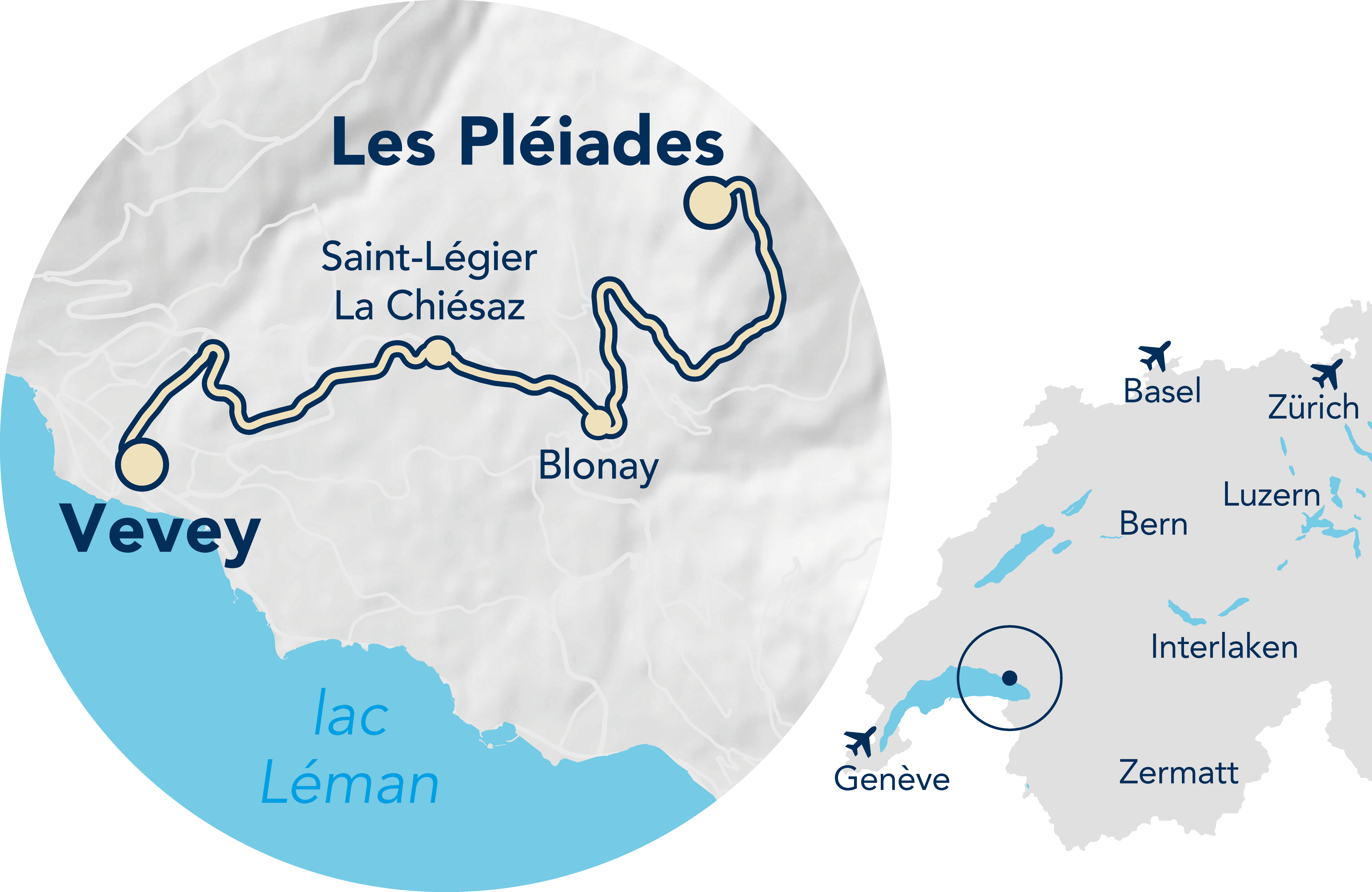Der Zug fährt langsam aufwärts. Seltsames Phänomen: Je weiter man sich vom Genfer See entfernt, desto grösser wird er. Der Konvoi macht eine Pause in Blonay. Sie Situation wird ernst. Zahn für Zahn steigt der Zug bis auf eine Höhe von 1.348 Metern. In „Les Pléiades“ ist die Aussicht atemberaubend: hier der Genfersee, dort der Neuenburgersee. Jezt können Sie sich entspannen und die Natur beobachten. Auf der schönen Aussichts-Terrasse vom Restaurant können Sie ein Glässchen trinken und eine gute Mahlzeit geniessen oder profitieren Sie von den verschiedenen Aktivitäten.